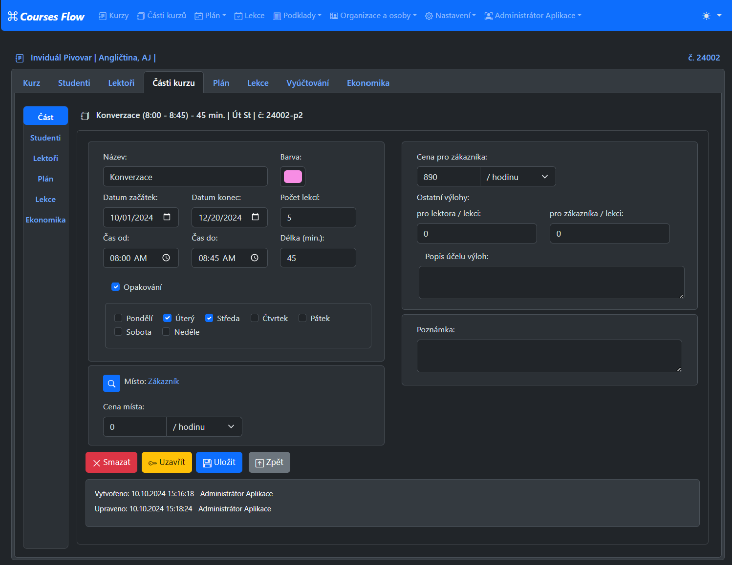 Aplikace je navržena tak, aby umožňovala efektivní správu širokého spektra kurzů. Kurzy jsou kategorizovány podle jejich typu, což se odvíjí od způsobu jejich realizace a fakturace, a dále podle zaměření jednotlivých činností v kurzu. Každý kurz může být rozdělen do více částí podle potřeby a specifik průběhu. Kromě monitorování vývoje samotného kurzu aplikace také sleduje klíčové přímé náklady a poskytuje podklady pro fakturaci jak zákazníkům, tak lektorům. Systém tak přináší nástroj pro řízení kurzů i základní ekonomické náležitosti spojené s jejich realizací.
